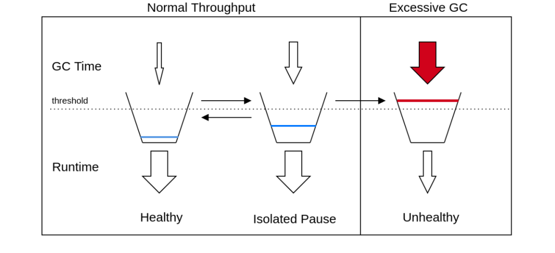 我们通过将JVM暂停GC的时间建模为“债务”来实现此想法。如果JVM花200毫秒的GC时间,它将增加200毫秒的债务计数器。运行程序代码所花费的时间“偿还”了所有累积的债务,因此,如果同一程序运行≥200ms,其债务计数器将降至零。如果JVM花费的运行时间与GCing的时间比例超过1:1(即吞吐量> 50%),则其债务将趋于零。另一方面,如果其吞吐量不到50%,其债务将趋于无限。这种“债务计数器”方法类似于用于跟踪程序吞吐量的漏斗算法。在这种情况下,我们以与GC时间成比例的速率添加水,并以与应用程序运行时间成比例地删除水: