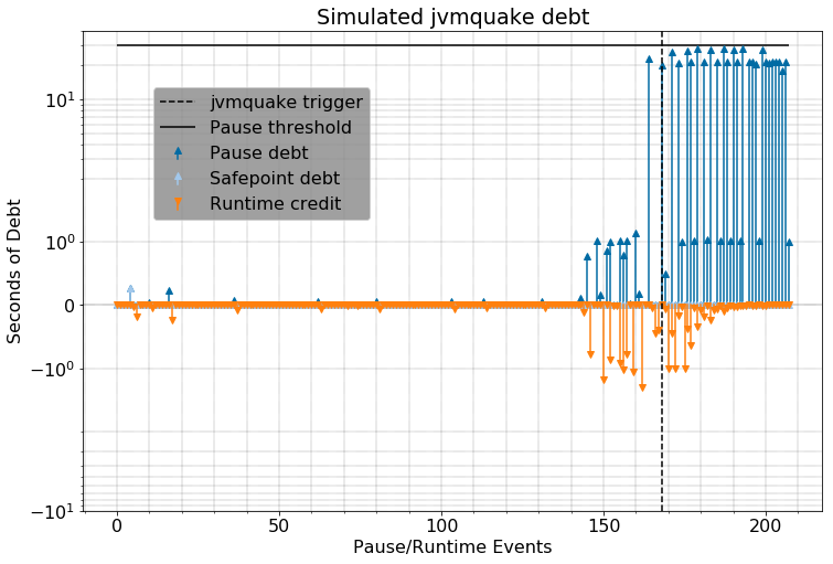 我们确定了一个可调整的阈值,默认值为30秒,这很宽松:如果JVM在完成GC时其债务计数器超过30秒,jvmquake将终止该进程。我们通过GarbageCollectionStart和GarbageCollectionFinish JVMTI回调来获取这些值。