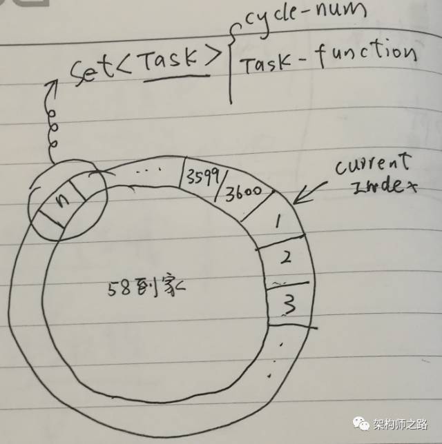 (2)计算这个Task的Cycle-Num,由于环形队列是3600格(每秒移动一格,正好1小时),这个任务是3610秒后执行,所以应该绕3610/3600=1圈之后再执行,于是Cycle-Num=1;