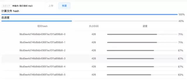 虽然实现了断点续传,但还需要修改一下进度条的显示规则,否则在暂停上传/接收到已上传切片时的进度条会出现偏差。