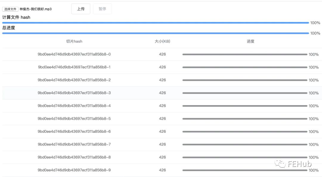 服务端则使用 hash 作为切片文件夹名,hash + 下标作为切片名,hash + 扩展名作为文件名,没有新增的逻辑。