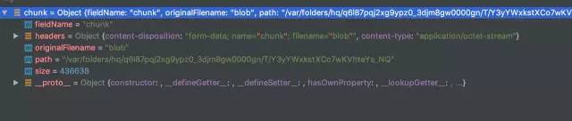 查看 multiparty 处理后的 chunk 对象,path 是存储临时文件的路径,size 是临时文件大小,在 multiparty 文档中提到可以使用 fs.rename(由于我用的是 fs-extra,其 rename 方法在 Windows 系统上存在权限问题,所以换成了 fse.move) 重命名的方式移动临时文件,也就是文件切片。