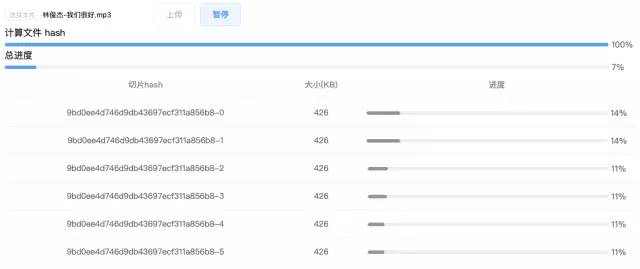 点击暂停会取消并清空切片的 xhr 请求,此时如果已经上传了一部分,就会发现文件进度条有倒退的现象:
