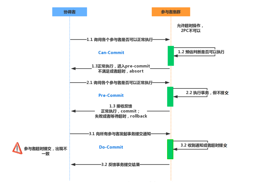 三阶段提交在两阶段提交的第一阶段与第二阶段之间插入了一个准备阶段,使得原先在两阶段提交中,参与者在投票之后,由于协调者发生崩溃或错误,而导致参与者处于无法知晓是否提交或者中止的“不确定状态”所产生的可能相当长的延时的问题得以解决。