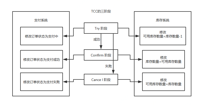 - 如果 Try 阶段执行失败,执行 Cancel 阶段,将订单状态修改为支付失败,可用库存数量修改为库存剩余数量。