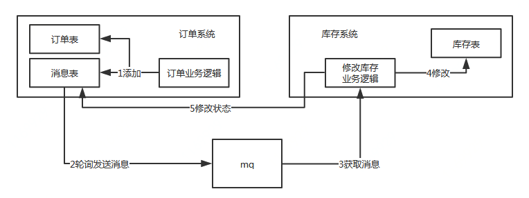 以本文中例子,在订单系统新增一条消息表,将新增订单和新增消息放到一个事务里完成,然后通过轮询的方式去查询消息表,将消息推送到 MQ,库存系统去消费 MQ。