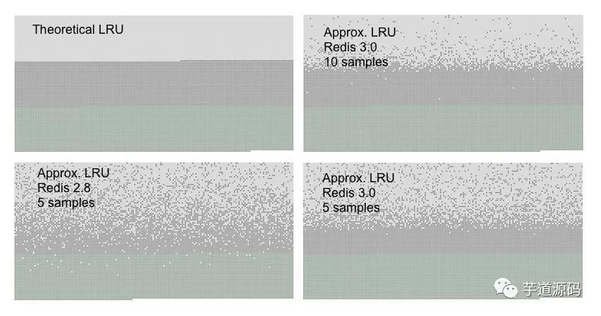 我们能看到Redis3.0采样数是10生成的图最接近于严格的LRU。而同样使用5个采样数,Redis3.0也要优于Redis2.8。
