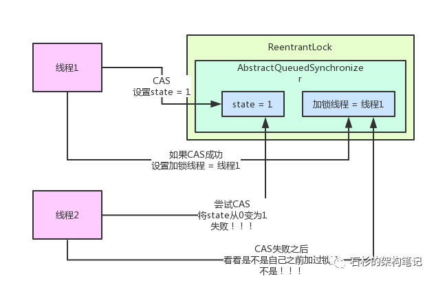 线程2跑过来一下看到,哎呀!state的值不是0啊?所以CAS操作将state从0变为1的过程会失败,因为state的值当前为1,说明已经有人加锁了!